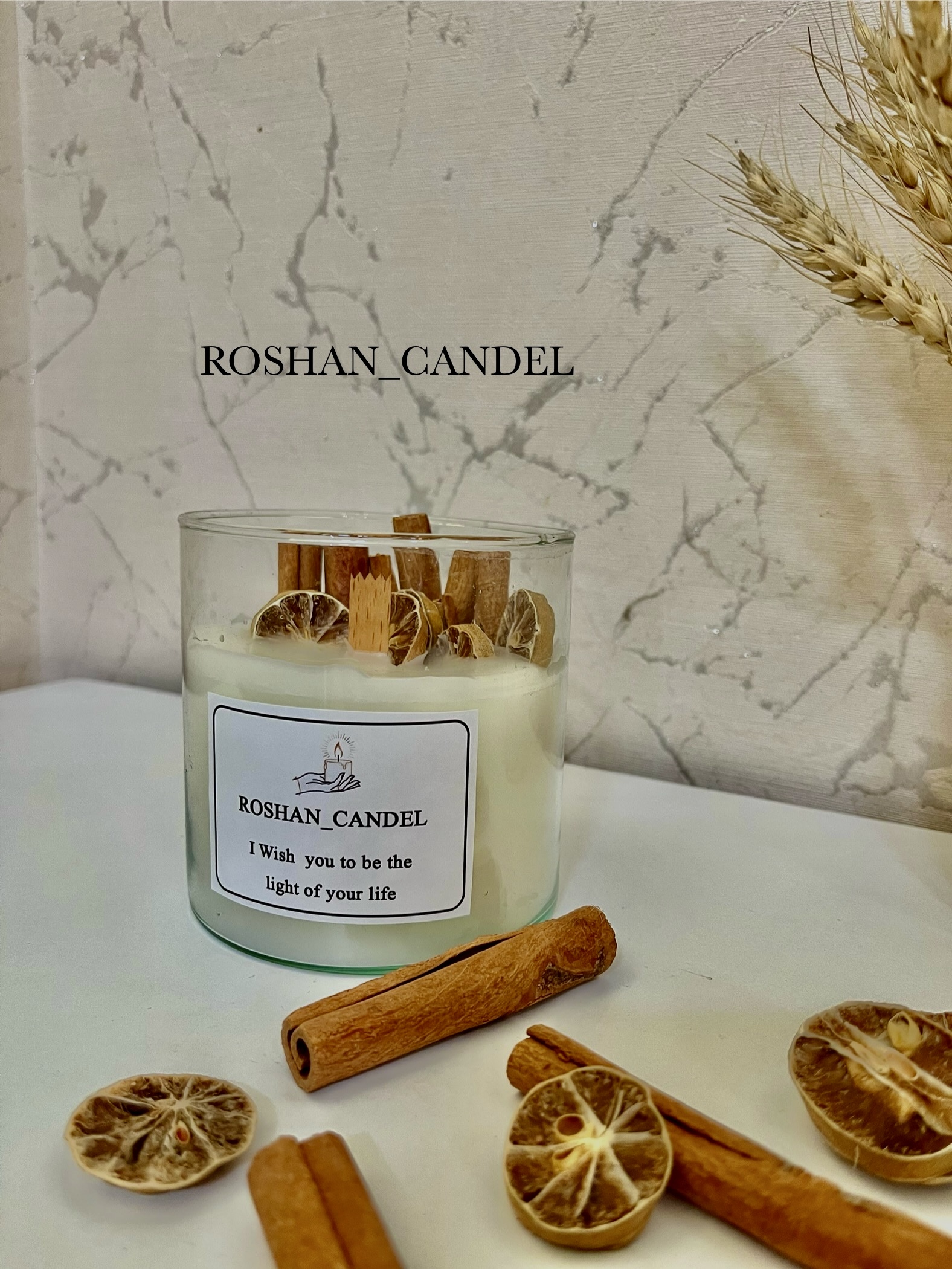 شمع شیشهایی با تزئین دارچین و لیمو و فندوق